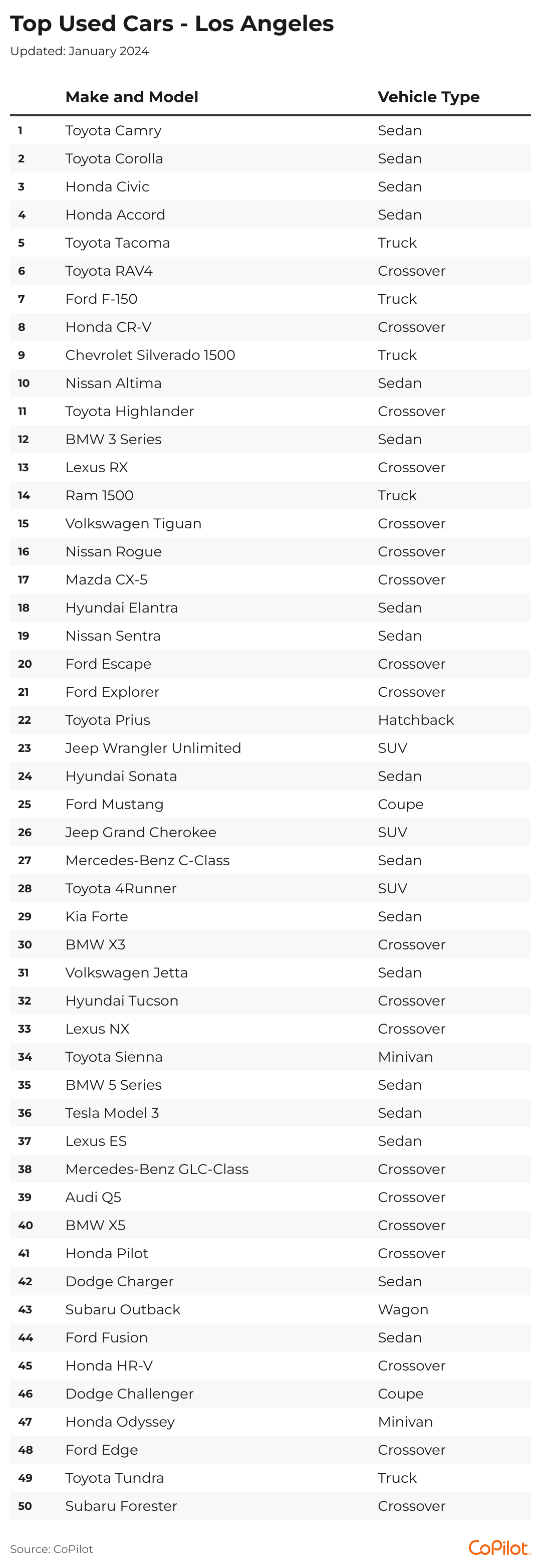 CoPilot analyzed national sales data to uncover the 50 top-selling used cars in the Los Angeles-Long Beach-Anaheim metro area.